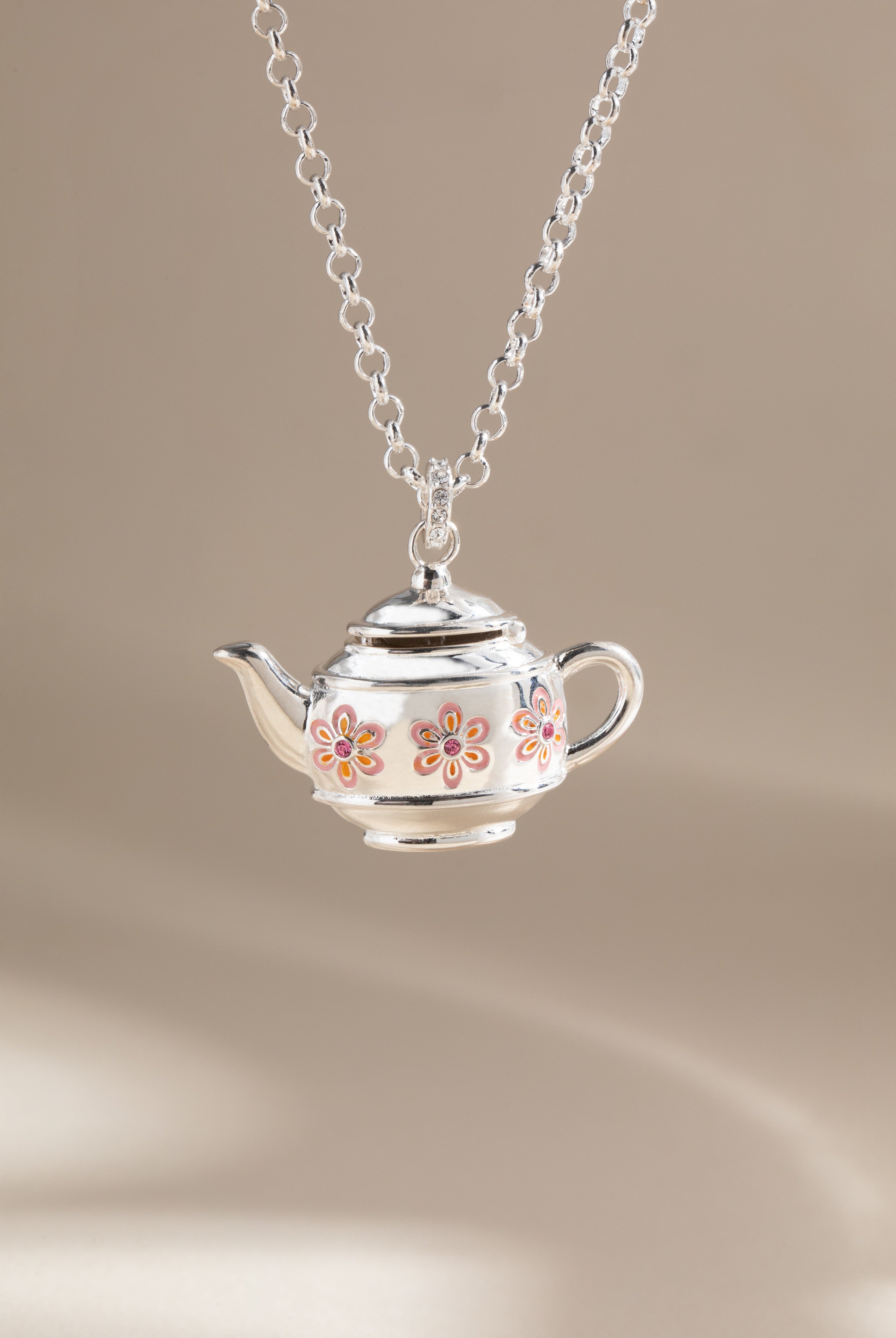 A charming nod to teatime traditions. This silver teapot pendant necklace features delicate pink floral details and opens to reveal a tiny tea bag hidden inside inscribed with "Have a cuppa." A sweet and whimsical piece that celebrates cozy moments and the simple joys of a perfectly brewed cup.